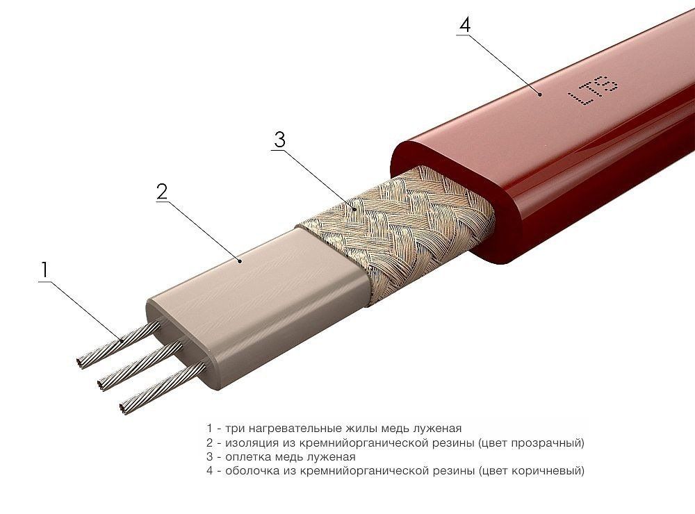 Трехфазный нагревательный кабель с тремя медными нагревательными жилами, изоляцией из кремнийорганической резины, оплеткой из медной луженой проволоки и оболочкой из кремнийорганической резины.